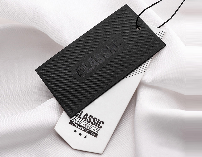 特殊工藝吊牌:服裝吊牌即各種服裝上吊掛的牌子,包含一些服裝材質,洗滌注意事項等信息。這種特殊工藝的吊牌的制作,在黑卡紙上做局部UV的圖案和標識,已達到增強吸引眼球的效果。